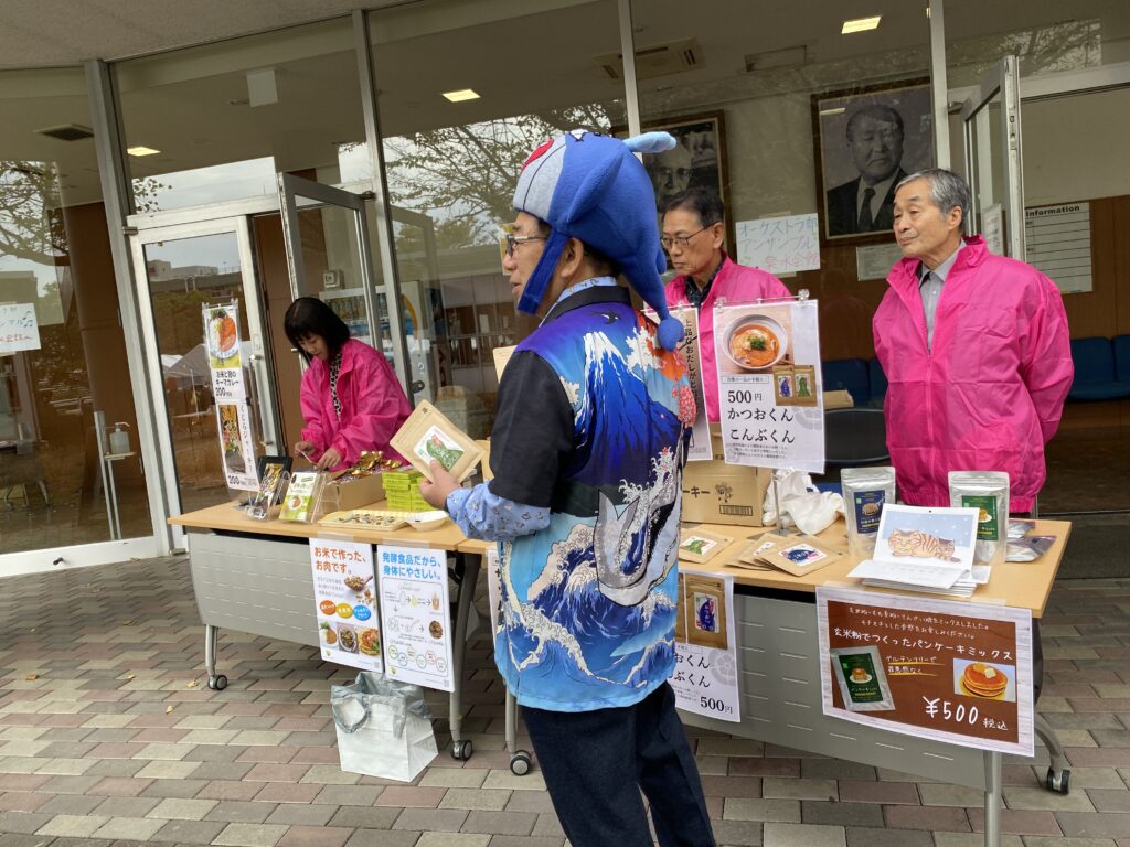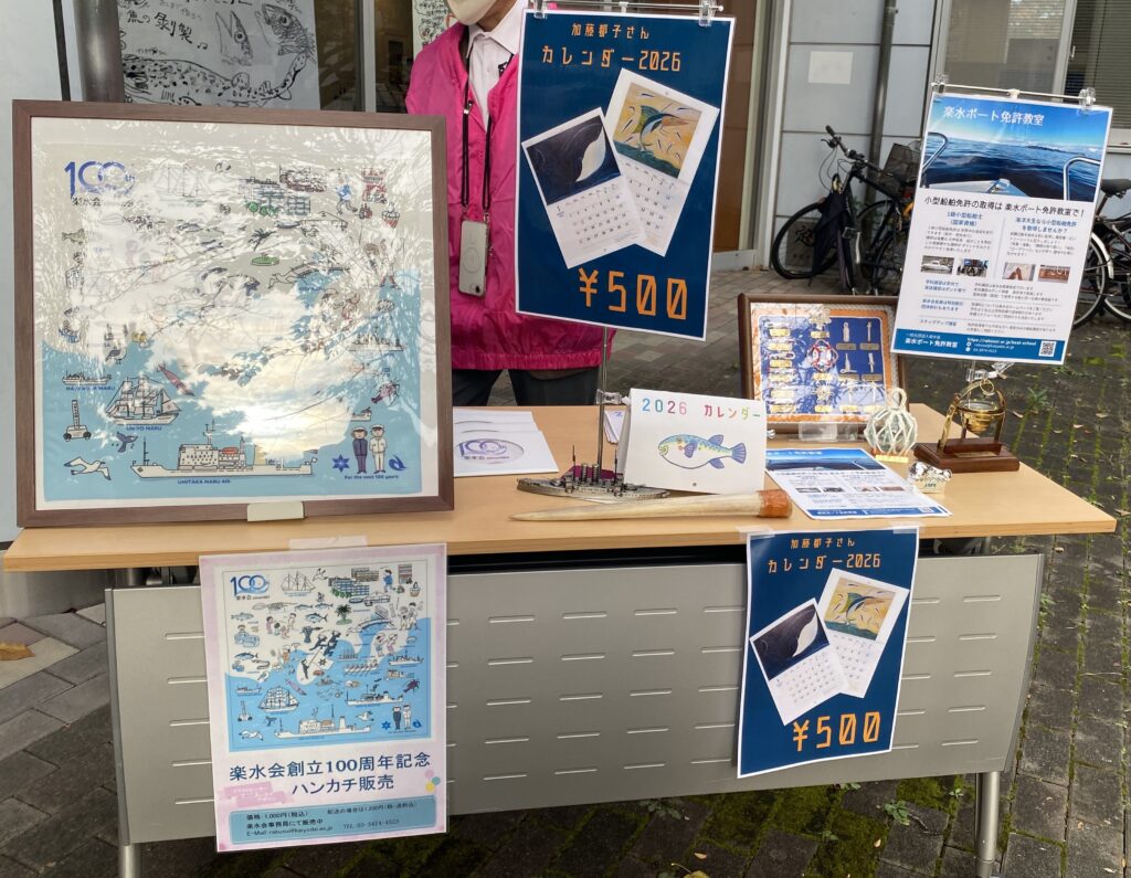 今年の海鷹祭は11月2日(日)~4日(火)に開催されましたが、楽水会は11月2・3日の2日間、「楽水市場」を出店しました。楽水市場では、楽水会オリジナルハンカチ、2026年カレンダー、サッパの煮干し、だし粉末、くじらジャーキー、お米と麹のキーマカレー、米粉のお好み焼き粉等を販売し、沢山の方々が足を運んでくださいました。